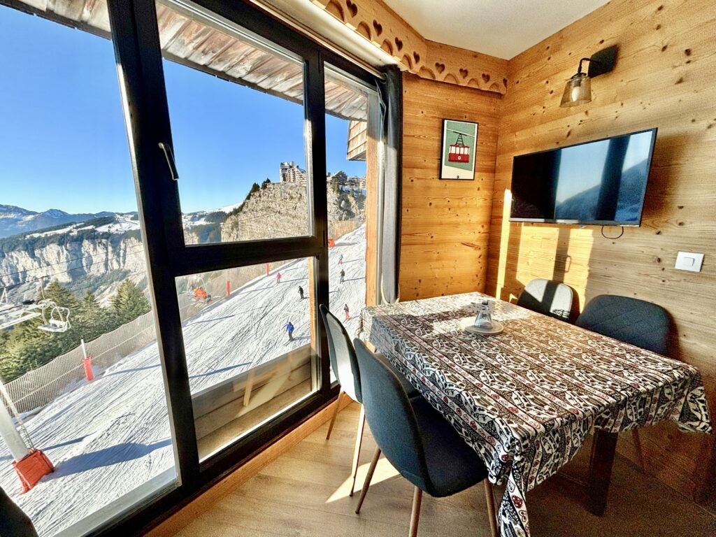 - Pièce à vivre comprenant une grande cuisine équipée et un espace séjour lumineux aménagé d’un coin repas et d’un canapé, offrant une très belle vue sur la Vallée de Morzine et une exposition Ouest