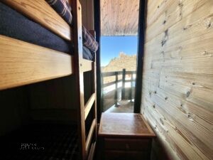 - Du côté chambres, vous trouverez une chambre cabine avec 2 lits superposés et une chambre avec lit double et accès au grand balcon.