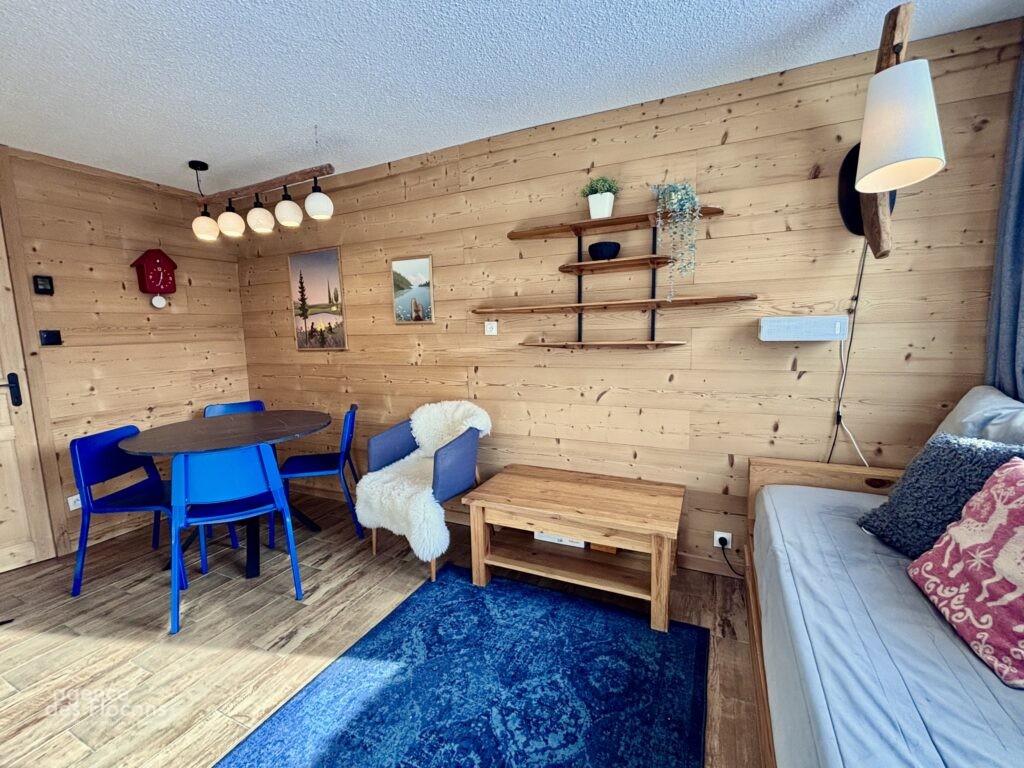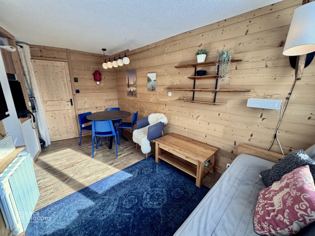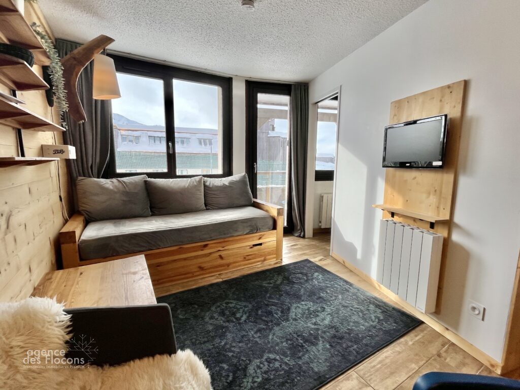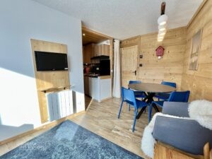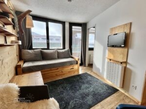 La pièce à vivre, lumineuse, dispose d’une cuisine équipée, d’un coin repas, ainsi que d’un espace salon avec banquette lit, elle s’ouvre sur un balcon exposé Sud-Sud-Ouest et offre une vue dégagée sur le domaine skiable. Enfin, une chambre équipée d’un lit double et de rangements complète l’organisation de cet agréable appartement.