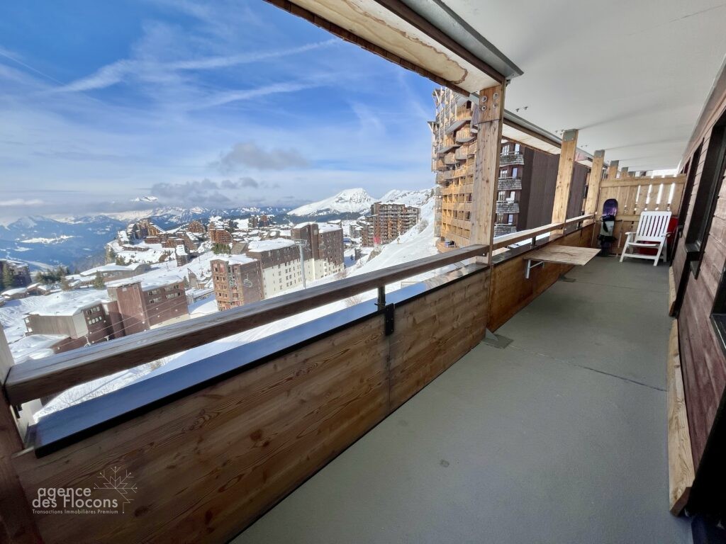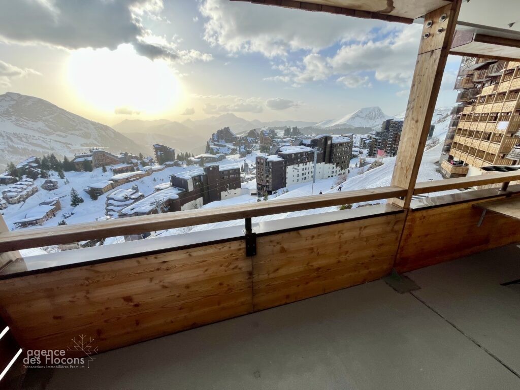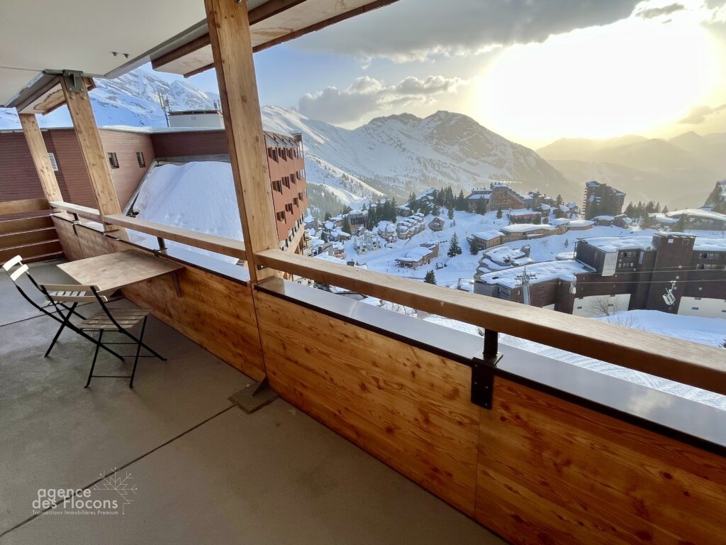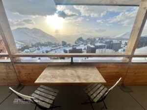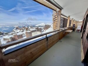 Accès au spacieux balcon offrant une vue panoramique sur la station et les montagnes.