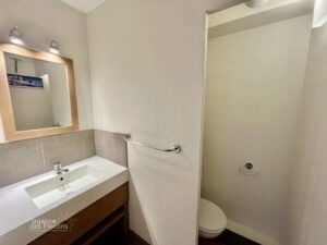 - Le premier espace offre l’intimité d’une grande chambre avec rangements et accès au balcon, d’une salle de bain avec baignoire et d’un WC séparé.