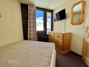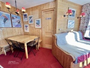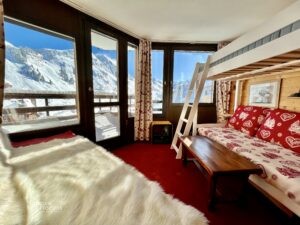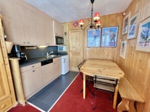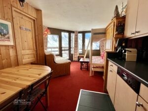 La pièce à vivre, très lumineuse, est aménagée avec une cuisine équipée, un coin repas confortable pour 6 personnes, et un espace salon agréable comprenant 1 banquette avec lit tiroir et 2 lits superposés. Accès au balcon offrant une exposition Sud-Est et une belle vue sur les montagnes.