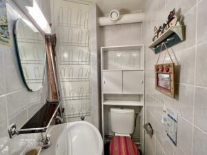 Grande entrée indépendante avec un double placard, donnant accès à une salle de bain avec baignoire équipé d’un sèche-chaussures, ainsi qu’à un grand WC indépendant avec lavabo.