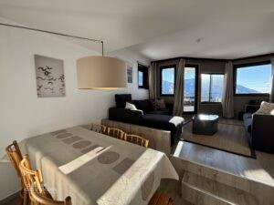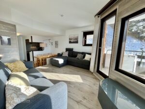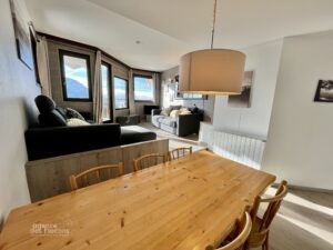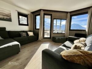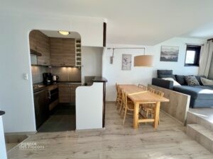 - Le séjour est composé d’une belle cuisine équipée et son espace repas confortable pour 6-8 personnes, ouverte sur un salon lumineux équipé de 2 canapés dont un convertible depuis lequel vous pourrez admirer un beau panorama sur le domaine skiable, accès à la terrasse offrant une belle vue sur la Vallée de Morzine et les couchers de soleil.