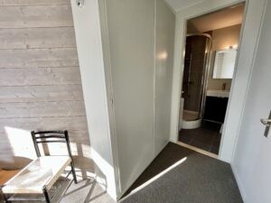 - L’espace nuit, au niveau inférieur, se compose d’une grande chambre lumineuse en suite avec salle de bain privative (surface de 15,3 m2) et d’une chambre de belle surface (8 m2) avec 3 lits superposés, toutes deux dotées de grands placards. Cet espace nuit confortable comprend également une salle d’eau avec douche, ainsi qu’un WC indépendant.