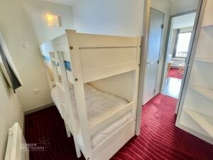 Dans l’entrée, espaces de rangement, un coin cabine avec 2 lits superposés, accès à la salle de bain avec baignoire et WC.