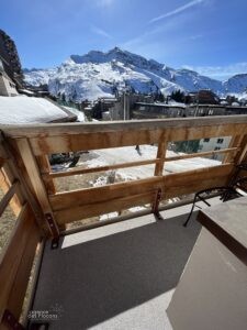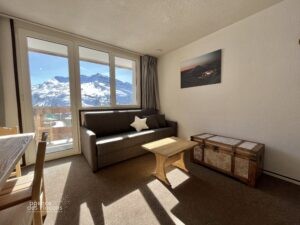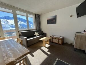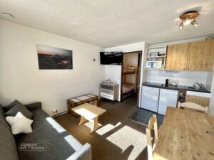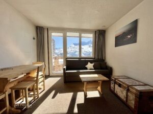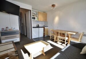 La pièce à vivre est lumineuse, elle dispose d’une petite cuisine ouverte, d’un coin repas, ainsi que d’un canapé convertible, elle s’ouvre sur un balcon exposé Sud-Sud-Ouest et offre très belle vue sur le domaine skiable.