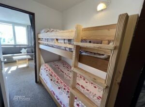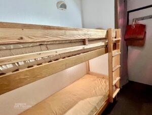 Entrée fermée équipée de 2 lits superposés et d’un placard de rangement, accès à une salle de bain avec baignoire et aux W.C séparés.