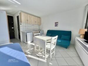 Entrance hall, giving access to the fully tiled living room fitted with a sofa bed and a convertible sofa, open kitchen with its dining area for 3 people.